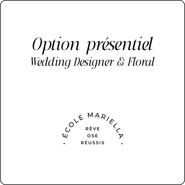 Cette option est réservée exclusivement aux élèves actuellement inscrit·es à la Formation e-learning – Spécialisation Wedding Designer + Floral – 4 mois. Elle te permet de poursuivre ton parcours en présentiel, lorsque tu choisis de rejoindre une session à l’École Mariella selon les places disponibles.