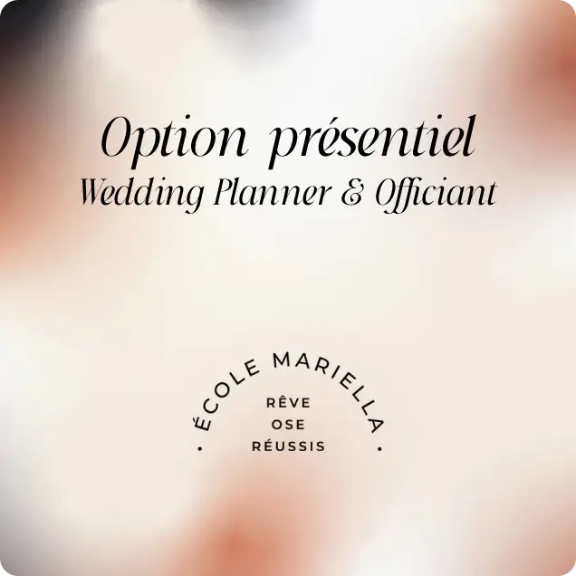 Cette option est réservée exclusivement aux élèves actuellement inscrit·es à la Formation e-learning – Spécialisation Wedding Planner + Officiant – 4 mois. Elle te permet de poursuivre ton parcours en présentiel, lorsque tu choisis de rejoindre une session à l’École Mariella selon les places disponibles.