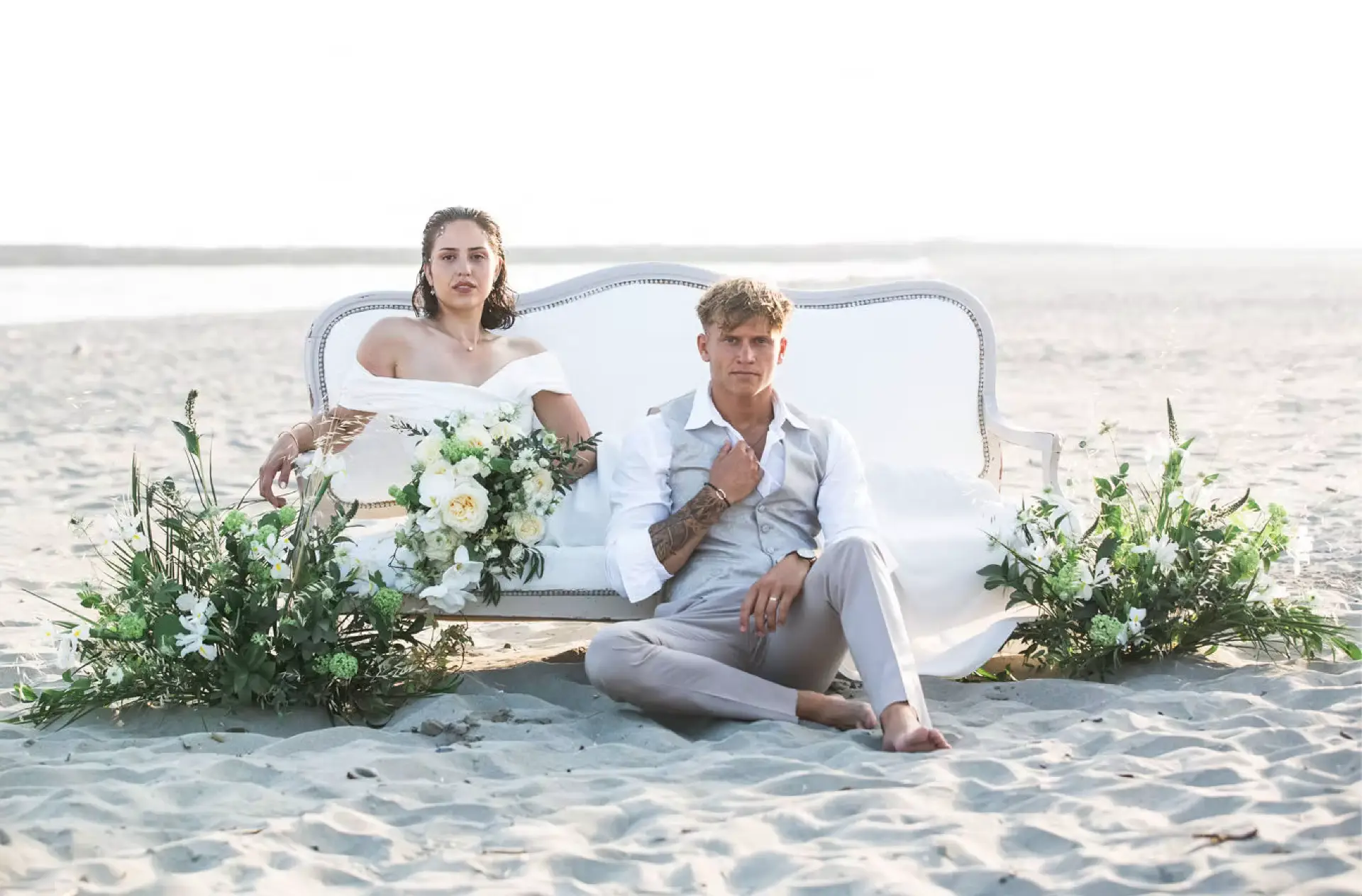 Un mariage à la plage chic et naturel, entre vagues et roses blanches. Le sable encore tiède, la lumière dorée d’un après-midi et le murmure des vagues en toile de fond.