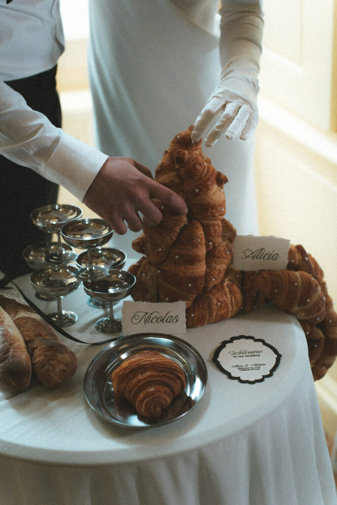 De même, les croissants sont disposés sur des assiettes en porcelaine fine. De plus, ils sont accompagnés de papeterie calligraphiée. En conséquence, ils deviennent les protagonistes d’une nature morte contemporaine dans ce shooting mariage. D’ailleurs, une pyramide de croissants perlés de sucre glace s’élève comme une pièce montée alternative.