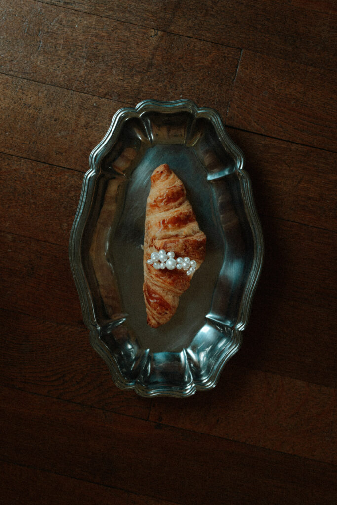 Ensuite, les bijoux en perles signées Atelier Lilac apportent une touche d’élégance patrimoniale. Enfin, le sac en perles, tenu par la mariée, accueille un croissant doré. Ainsi, cette image devient emblématique du shooting inspiration mariage. En effet, elle représente la rencontre entre haute couture et gastronomie quotidienne.