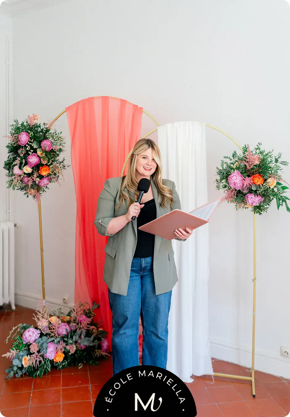 Chez Mariella Formation, on t’apprend à devenir Officiant·e de cérémonie laïque : un métier riche de sens, en plein essor, qui te permet de vivre des instants uniques et de transmettre des valeurs fortes à travers tes mots.